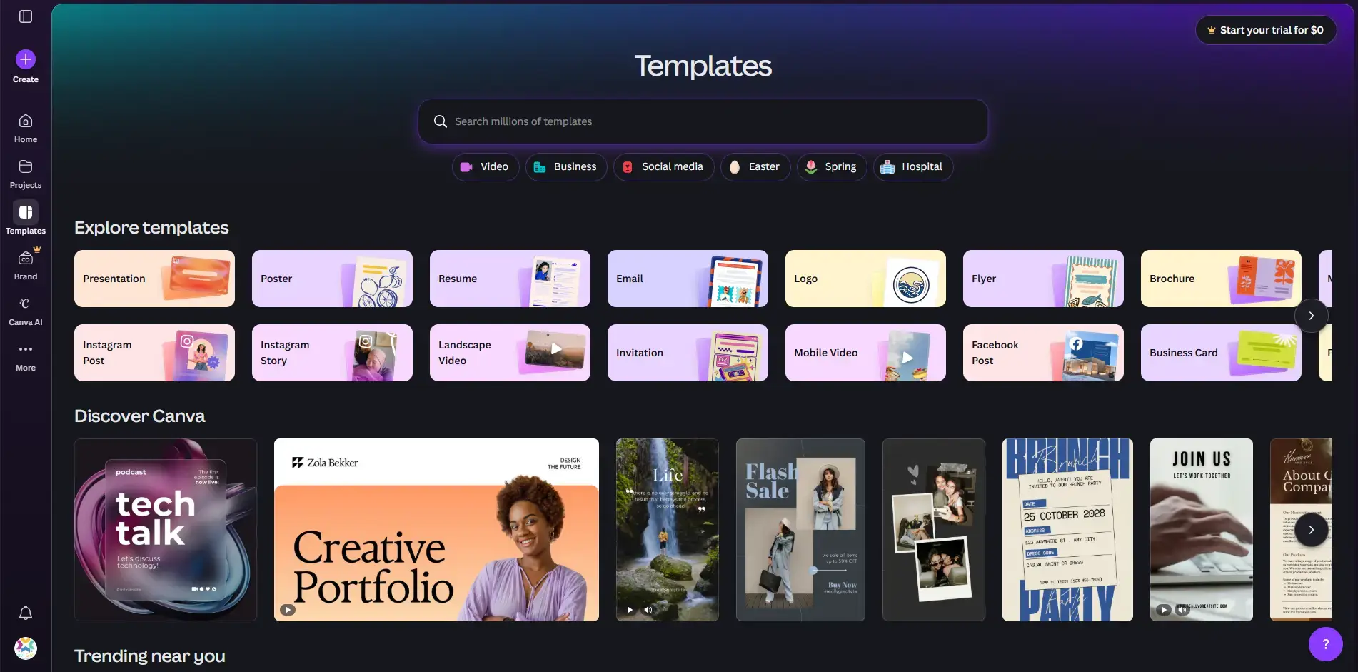 The free tier gives you 5GB of cloud storage and access to millions of free templates. An account is required. Premium stock assets (marked with a crown icon) and CMYK export for professional printing both require Canva Pro.