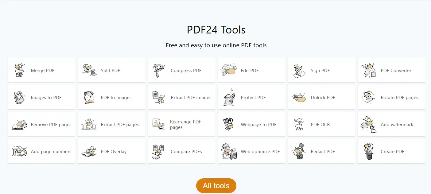 PDF24 is the benchmark. No task limits, no file size caps, no signup, and no paywall anywhere on the site. You get merge, split, compress, convert, OCR, and basic text editing all in one place. The trade-off is ads, which is how they keep the lights on. The ads are not intrusive enough to be a dealbreaker for most people.