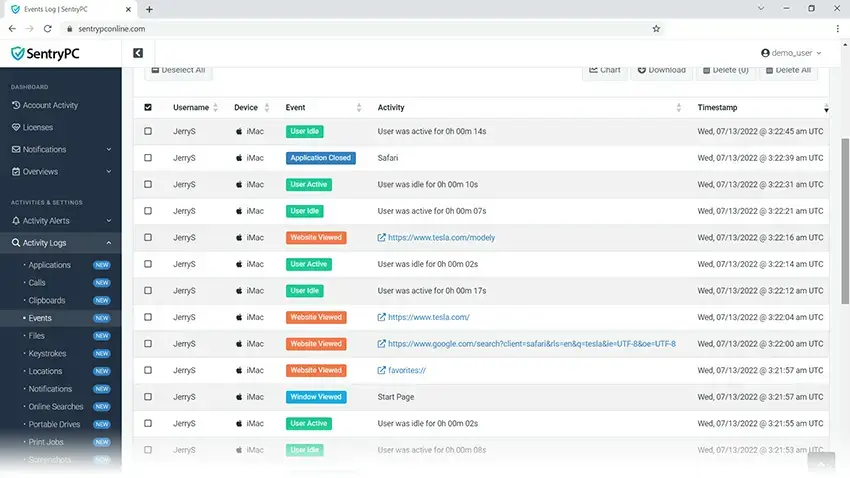 SentryPC is monitoring and control software built around a cloud dashboard. You install a small agent on the device you want to watch, and from that point everything that user does is recorded and sent to your online account. You can check logs, run reports, create charts, and change filtering rules from any web browser without ever going near the monitored machine.